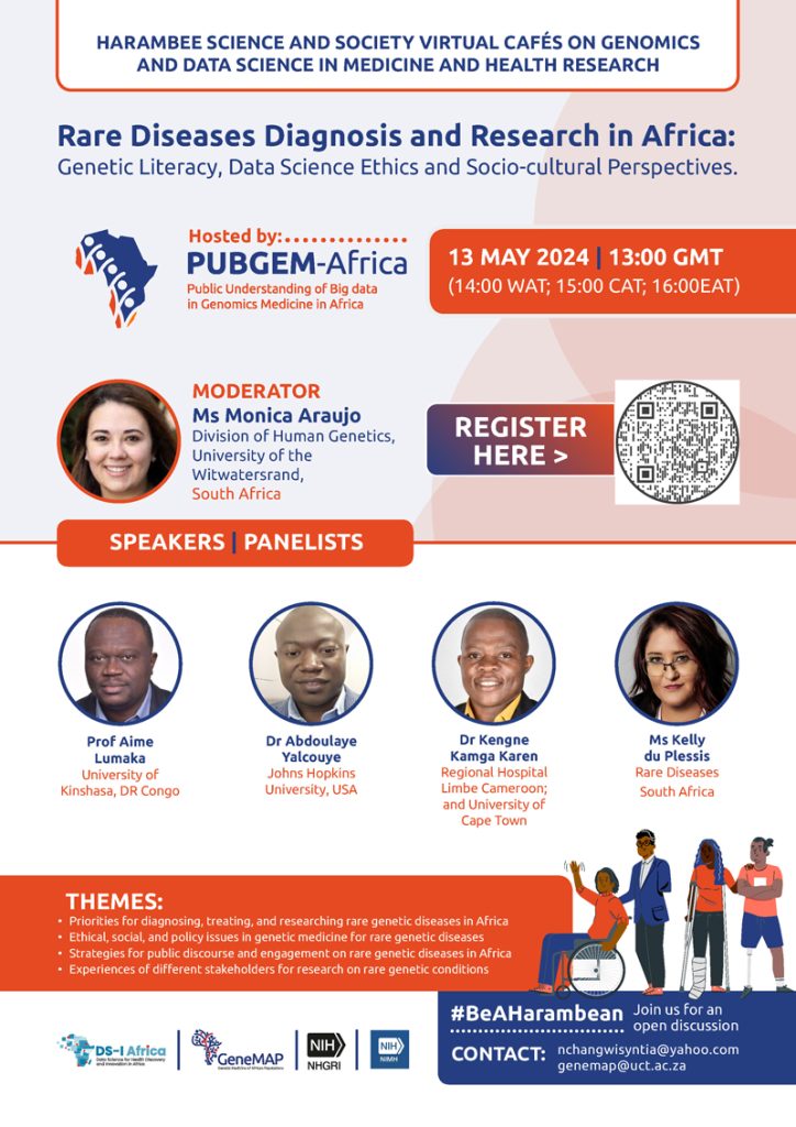 The second Harambee Virtual Science and Bioethics café continued with a discussion on rare diseases. The main focal points presented and discussed were genetic literacy, data science ethics, and sociocultural perspectives. The important points include, 1) informed consent and privacy, that patients understand the implications of genetic testing and that their data is protected; 2) cultural sensitivity, respecting cultural beliefs and practices when discussing genetic conditions and interventions. Effective public engagement strategies that include awareness campaigns and community involvement are essential to foster understanding and support for addressing rare genetic diseases. Additionally, incorporating the diverse experience of patients, researchers and policymakers is crucial for a holistic approach to research and address rare genetic diseases, and to ensure that policies and interventions are evidence-based.